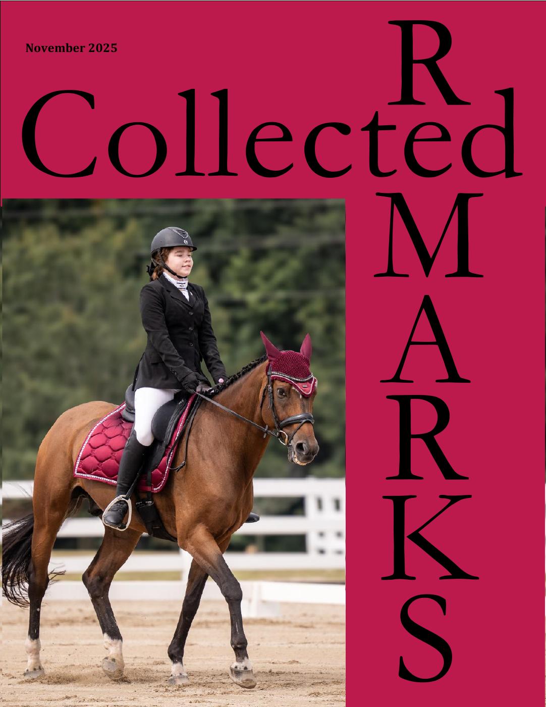 Collected Remarks welcomes submissions of quality color dressage and sport-horse photographs. All mounted riders must be wearing appropriate headgear (a safety helmet, a derby, or a top hat). We also accept submissions of action and conformation shots of breeding stock and dressage sport-horse breeding classes. Interesting and creative photos that capture special moments between horses and riders also will be considered. Photos must be accompanied by complete captions, including the full names of all subjects. For print, only high resolution (300dpi) Jpeg or PDF files will be accepted. Photographers whose work is published will receive proper credit, notification when the issue is published online. Photo Release Form The editors are happy to review unsolicited submissions of photographs. Please submit photographs electronically to designonpenny@yahoo.com and yearbook@gdcta.org. | 2025 Issues Jan/Feb July / 'GDCTA Camp" Special Edition June December 2024 Issues June 50th Anniversary Special Edition 2023 Issues Past issue PDFs can be requested at yearbook@gdcta.org. |